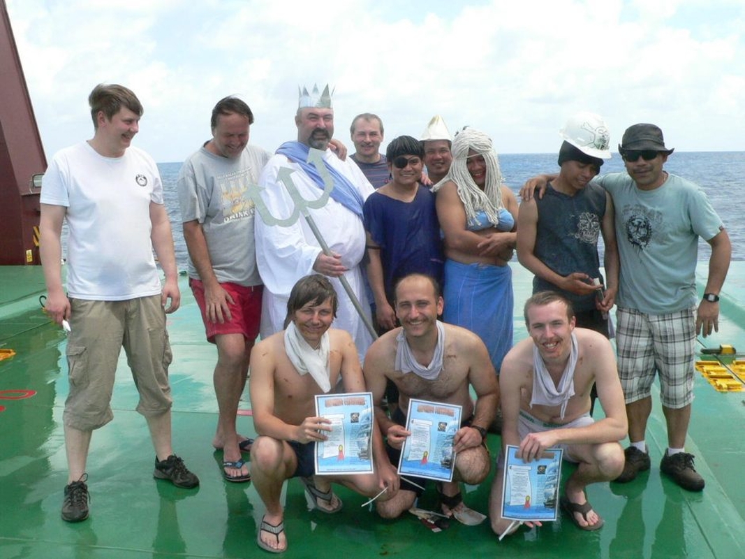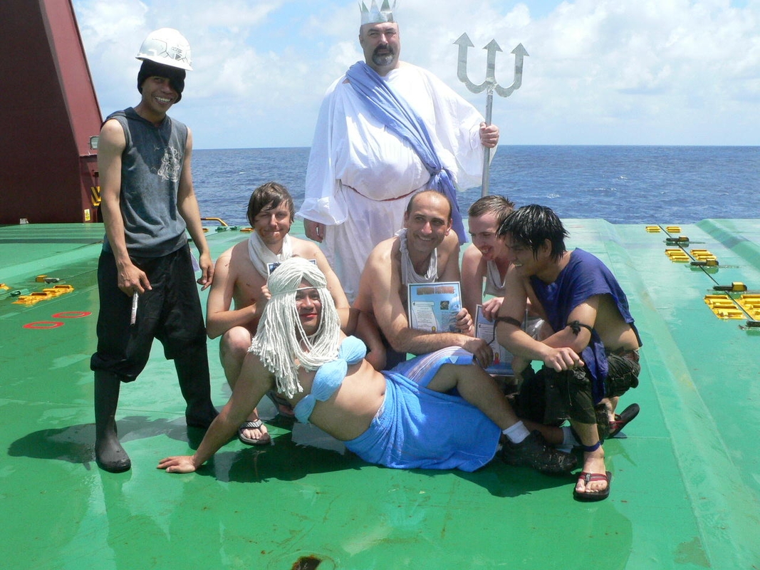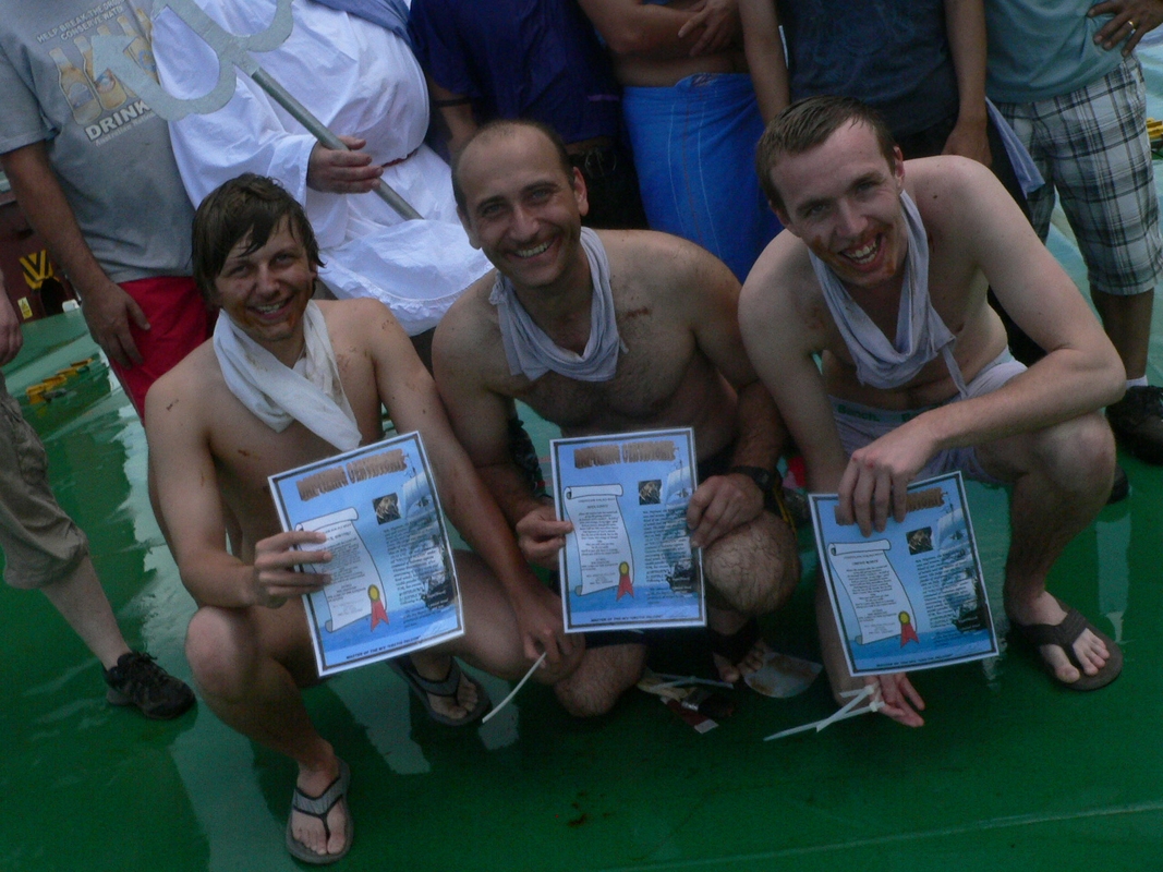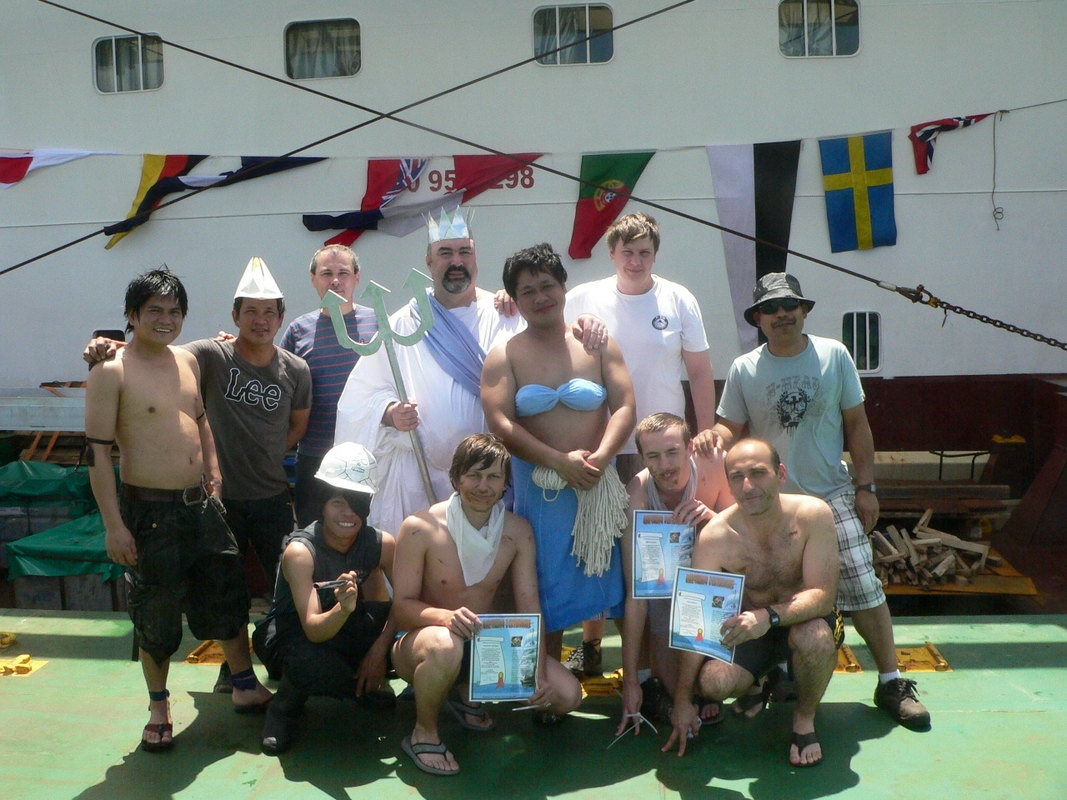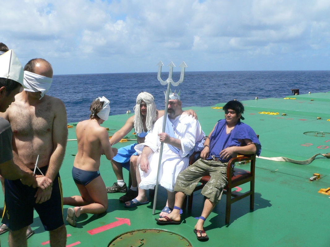 Įgulai įsimintiniausias plaukimo epizodas - naujokų krikštynos kertant ekvatorių. V.Pozonkevičius iš šios ceremonijos atsiuntė nuotraukų.