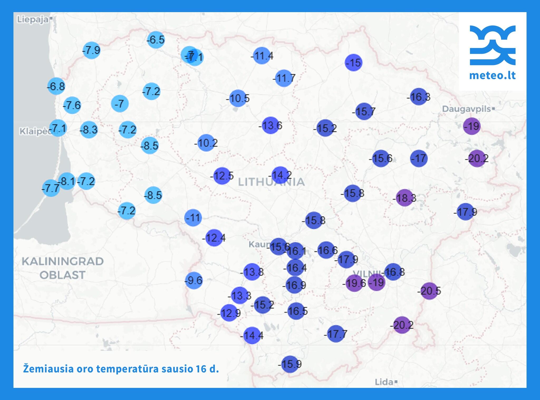 Sekmadienį nesnigs. Vėjas pietryčių, pietų, 7–12 m/s. Temperatūra naktį 12–17, dieną 5–10 laipsnių šalčio.