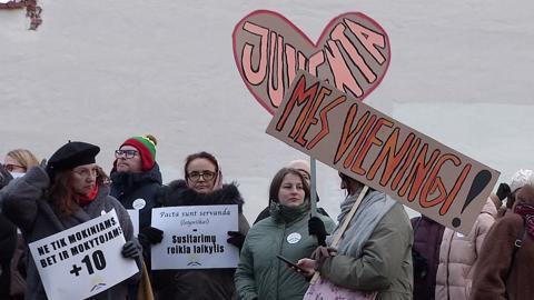 Proteste dalyvavę mokytojai teigė, jog ministerija dėl finansavimo nori supriešinti švietimą ir gynybą.