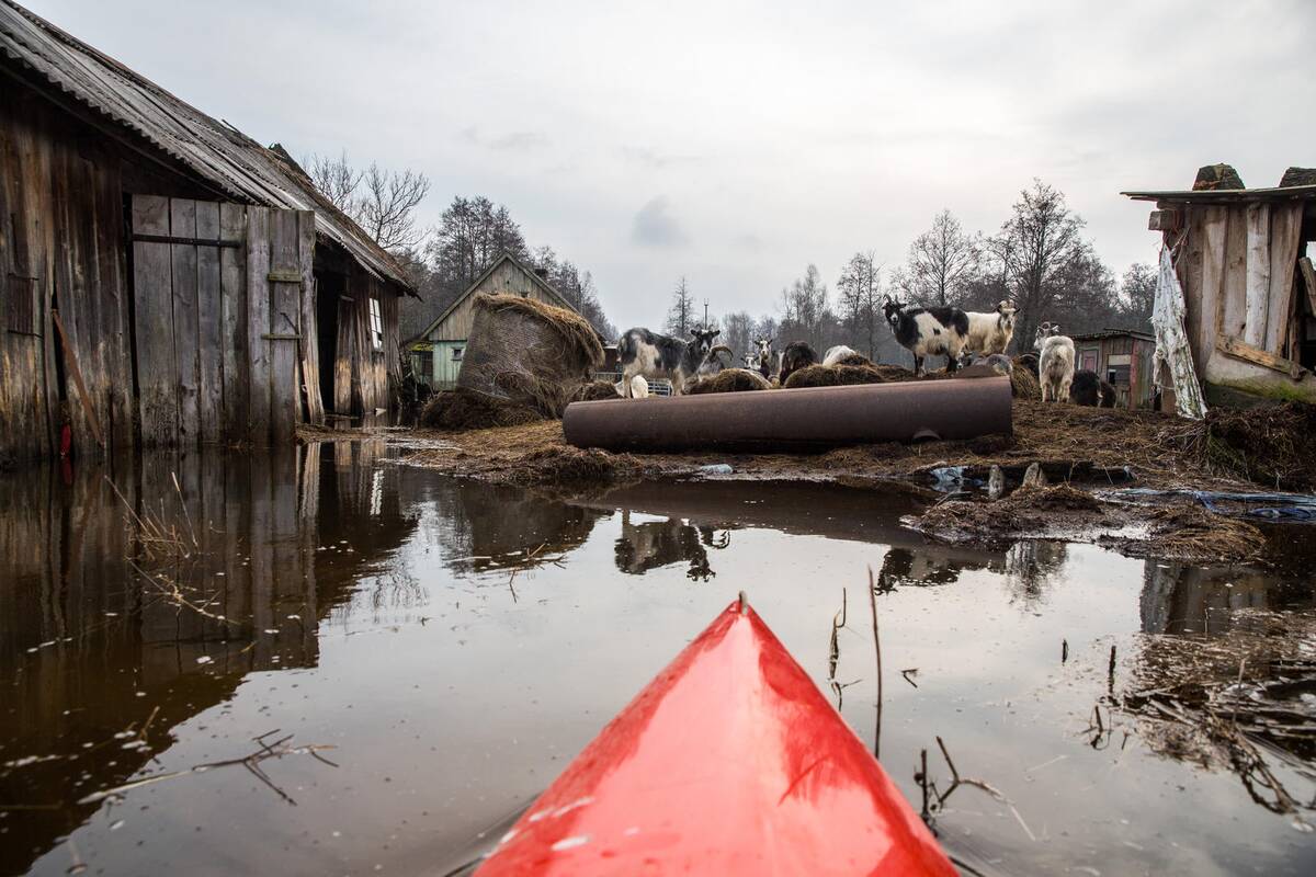 Kieme sena apsamanojusi ir išklerusi valtelė, sukiužęs avilys, mėtosi kažkokie aprūdiję rakandai. Plaukiojant po kiemą, akis ūžkliūva už kraupaus vaizdo – dviejų paskendusių ožkų. Vienos tik kanopos kyšojo iš vandens, o kita visa šlapia parkritusi ant šieno. Nuo durpių juodas ledinis vanduo gelia taip, kad tikriausiai ne tik ožka, bet ir žmogus neišgyventų įkritęs.
