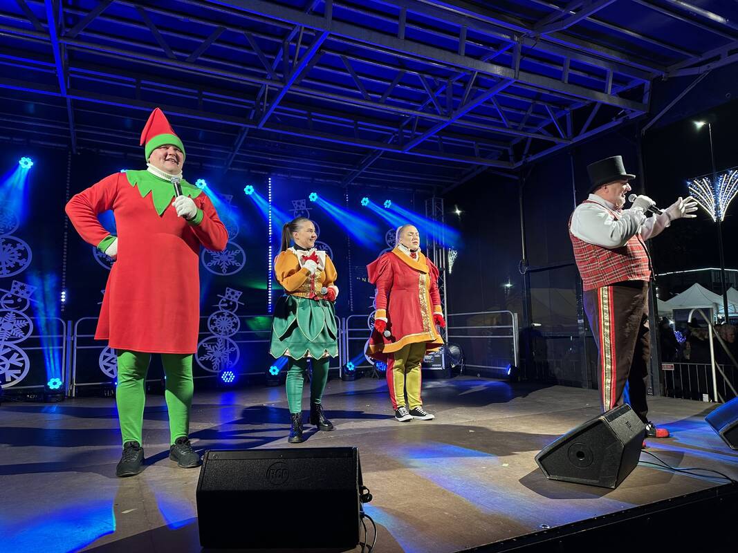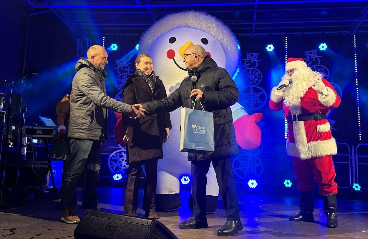 Po pasirodymo ant scenos pakviestas Prienų rajono savivaldybės meras Alvydas Vaicekauskas kartu su Kalėdų Seneliu įžiebė miesto eglę. Ryškiai suspindusi įspūdinga net 14 metrų aukščio žaliaskarė sulaukė gausių aplodismentų ir džiaugsmo šūksnių. Meras, pasveikindamas susirinkusius prieniečius, linkėjo visiems šviesaus ir jaukaus šventinio laikotarpio bei padėkojo tiems, kurie prisideda prie miesto gražinimo. Šiemet eglutę miestui padovanojo pakuoniškiai Vilma ir Julius Baranauskai – jiems įteikta speciali padėka ir simbolinė dovana.