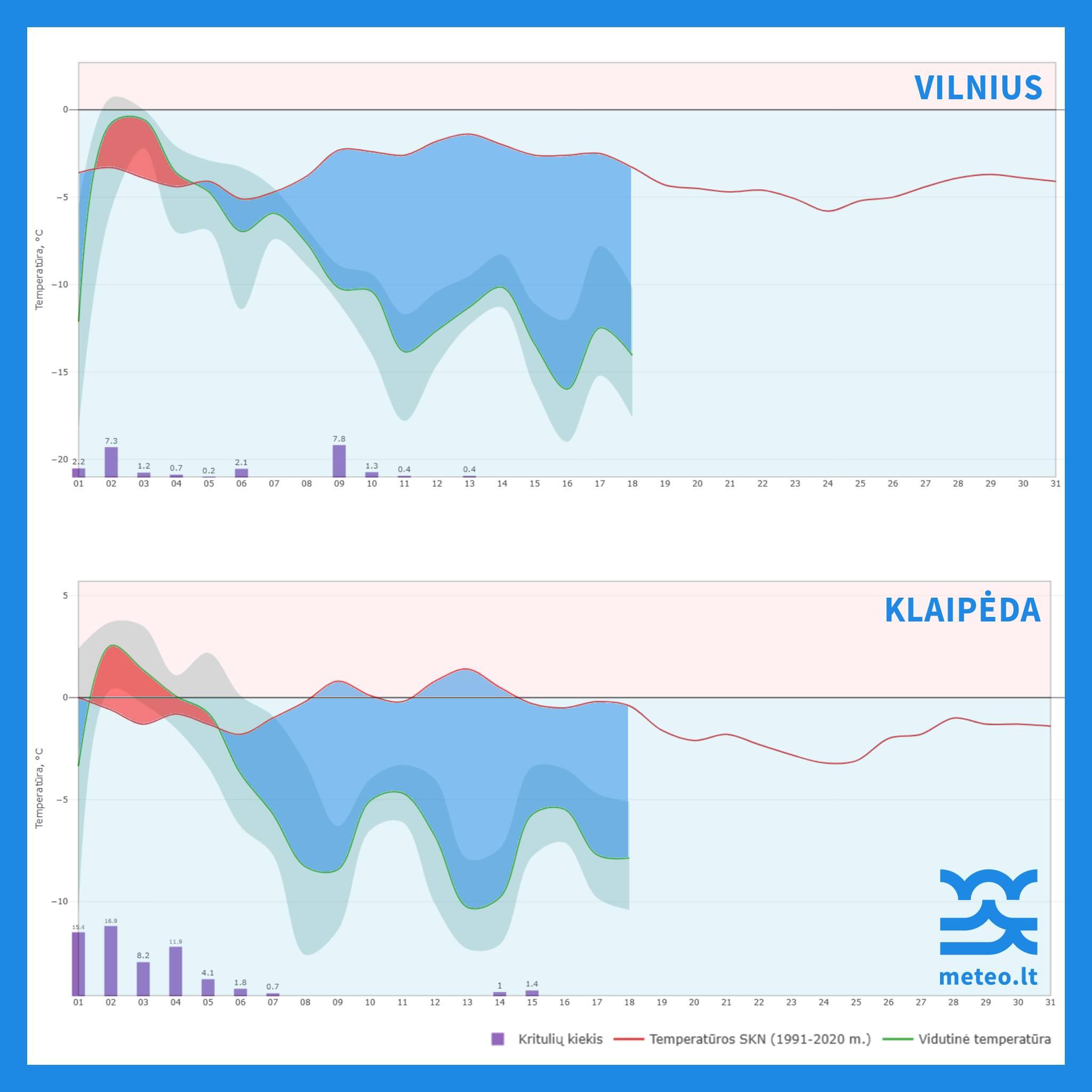 Vidutinė sausio 1–18 d. laikotarpio oro temperatūra Vilniuje siekė 9 laipsnius šalčio, o Klaipėdoje 4,8 laipsnio šalčio (anomalijos, atitinkamai, buvo net 5,9 ir 4,5 laipsnio šalčio). Per praėjusią mėnesio dalį Vilniuje buvo 15, o Klaipėdoje – 14 dienų šaltesnių už 1991–2020 m. laikotarpio vidurkį. Vidutiniškai šilčiausios Lietuvoje pasitaikė sausio 2–5 d., o šalčiausios buvo sausio 11–18 dienos.