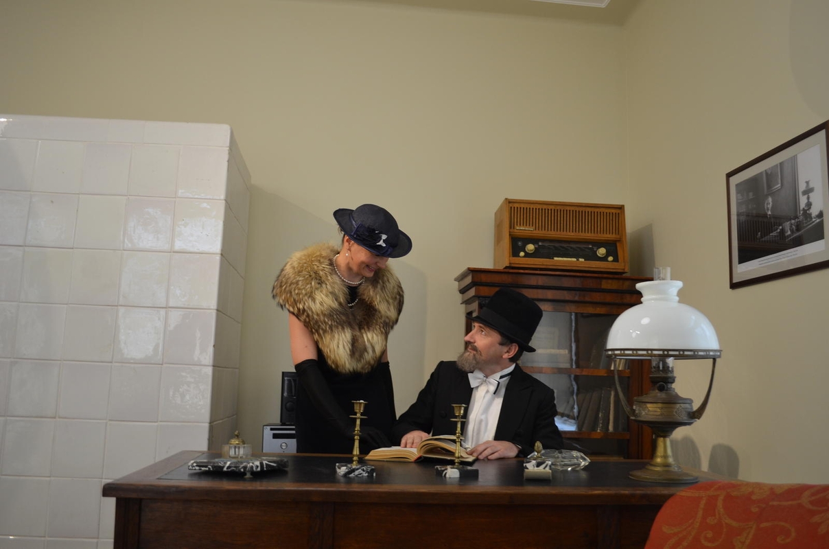 Prezidento vaidmenį kuriantis D.Kaplūnas atsistojo ir, galantiškai kilstelėjęs nuo galvos katiliuką, pasiūlė užeiti į dvaro rūmus. Pakeliui parodė žydinčius gėlynus, seną liepų alėją, vedančią tiesiai į Lėno ežerą. Jo pakrantėje švietė naujas medinis pirties pastatas, bolavo paplūdimys. Kiek atokiau nuo ežero darbininkai baigė statyti Smetoninėms pavėsinę, o šalia rūmų moteris šlavinėjo lapus. Atsiprašęs viešnių, prezidentas priėjo prie dirbusios moters ir, pasisveikinęs su ja, paklausė, kaip sekasi. Moteris kiek sumišo, pamačiusi neįprastai apsirengusį, su katiliuku ant galvos vyrą, tačiau greitai atsitokėjo ir nedrąsiai ištarė: "Ačiū, gerai, prezidente."