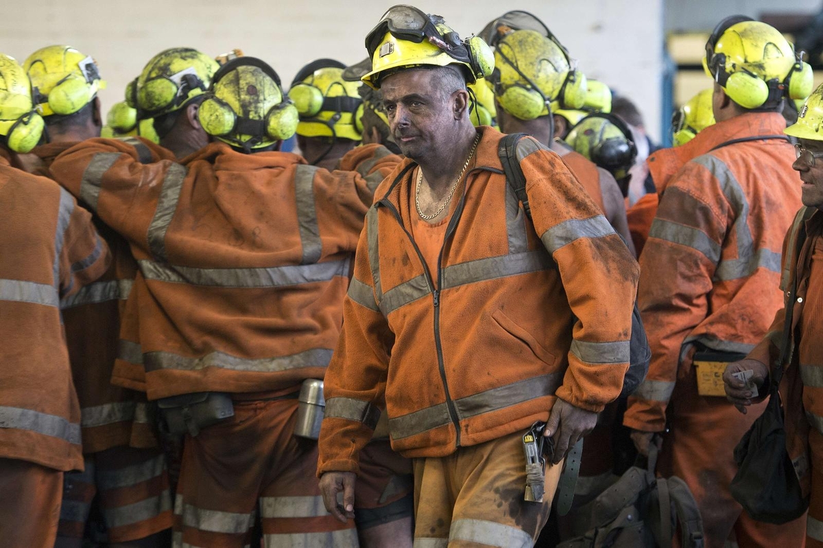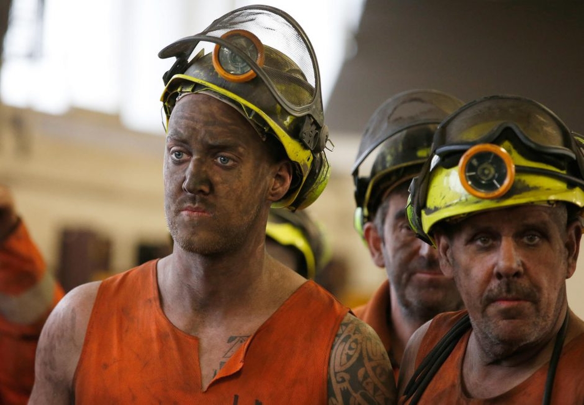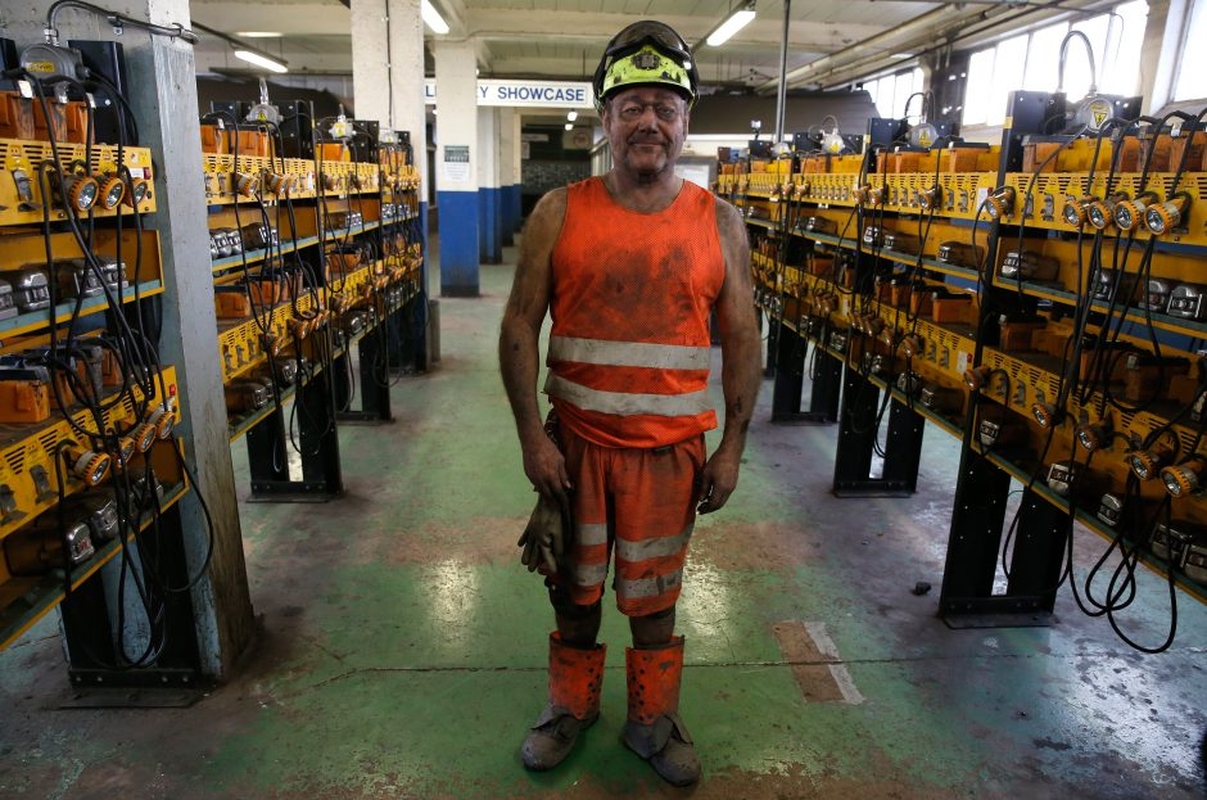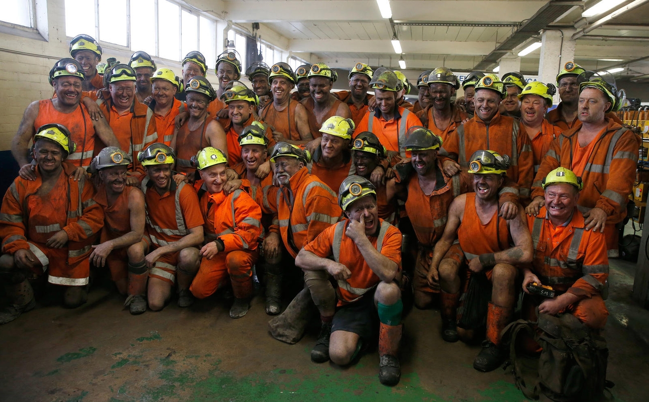 Anglies dulkėmis dengtus oranžinius kombinezonus vilkintys darbininkai, užsidėję kalnakasių šalmus, vorele išėjo iš Kelinglio anglių kasyklos (Kellingley Colliery) Anglijos šiaurėje; angliai kasti 800 metrų gylyje po žeme buvo pasamdyta 450 šachtininkų.