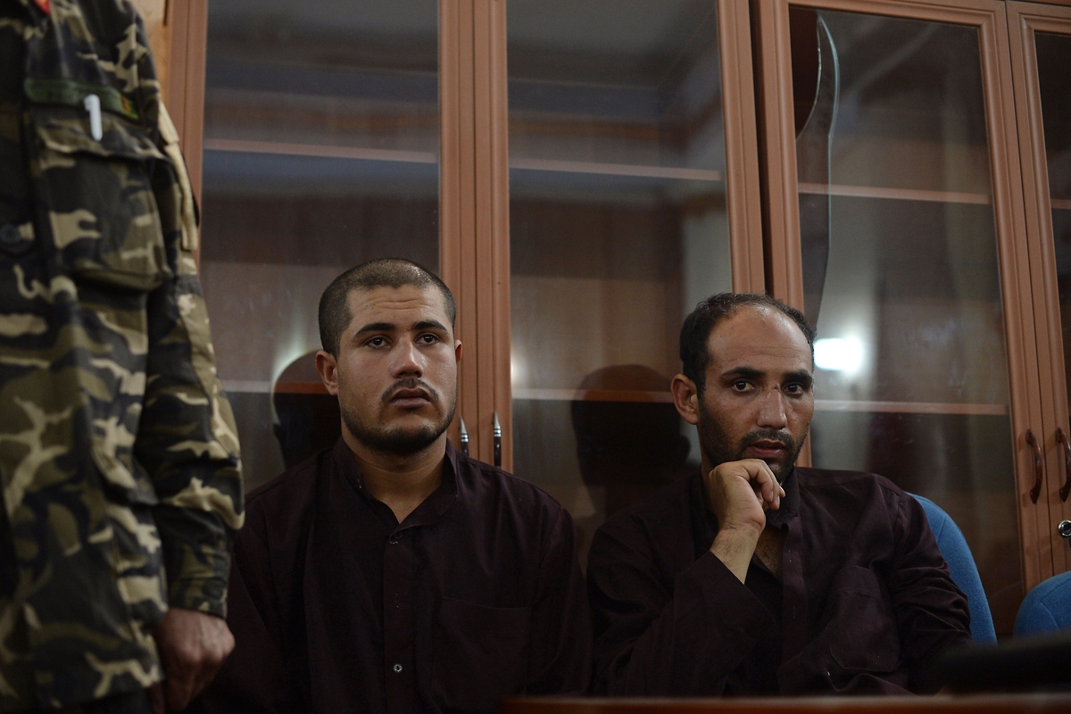 Demonstrantai prie teismo pastato triukšmingai reikalavo mirties bausmės, o teismo salė pratrūko plojimais, kai Kabulo policijos viršininkas Zahiras Zahiras taip pat paragino tuos vyrus pakarti.
