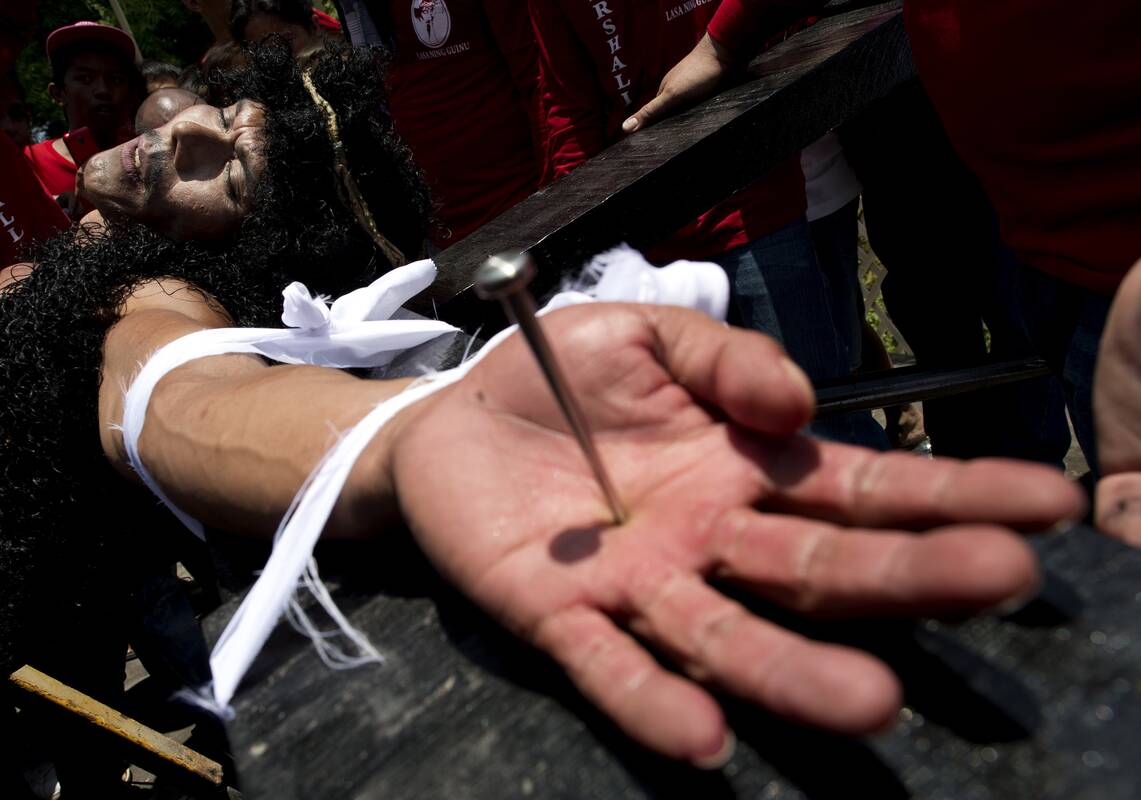 Tikintieji Šiaurės Filipinų kaimuose Didįjį penktadienį leidosi prikalami prie medinių kryžių, kad tokiomis drastiškomis priemonėmis atkartotų Jėzaus Kristaus nukryžiavimą, o tūkstančiai žiūrovų iš pačių Filipinų ir užsienio stebėjo šias kruvinas apeigas, kurių tradicija gyvuoja nepaisant Katalikų Bažnyčios nepritarimo.