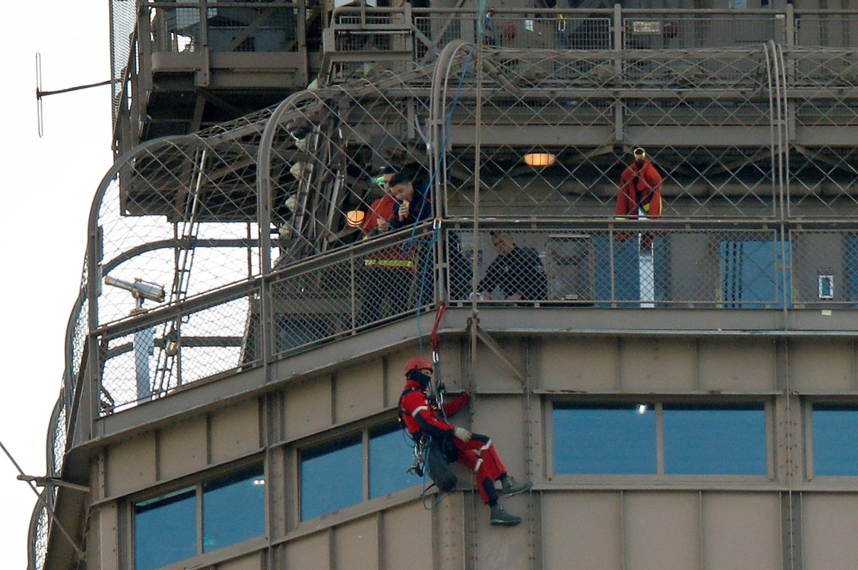 Ugniagesių specialaus aukštalipių padalinio darbuotojai, kurie virve nuo trečio aukšto apžvalgos aikštelės, esančios netoli bokšto viršūnės, nusileido prie juoda striuke vilkėjusio vyro, sugebėjo įtikinti jį nulipti.