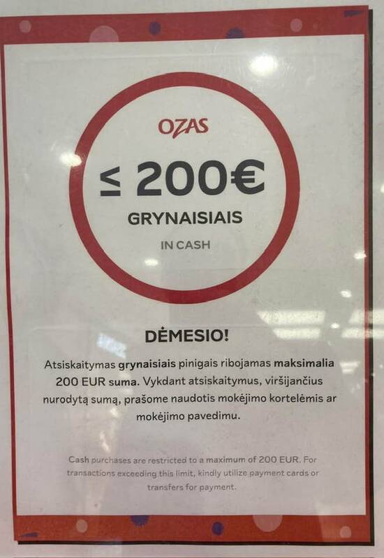 Mažas informacinis plakatas papiktino daug prekybos centro „Ozas“ pirkėjų. Jame – įspėjimas, kad atsiskaitymas grynaisiais pinigais ribojamas iki 200 eurų. Vėliau informacija plakate patikslinta, kad šis ribojimas galioja perkant ne visas prekes, o tik „Ozo“ dovanų korteles.