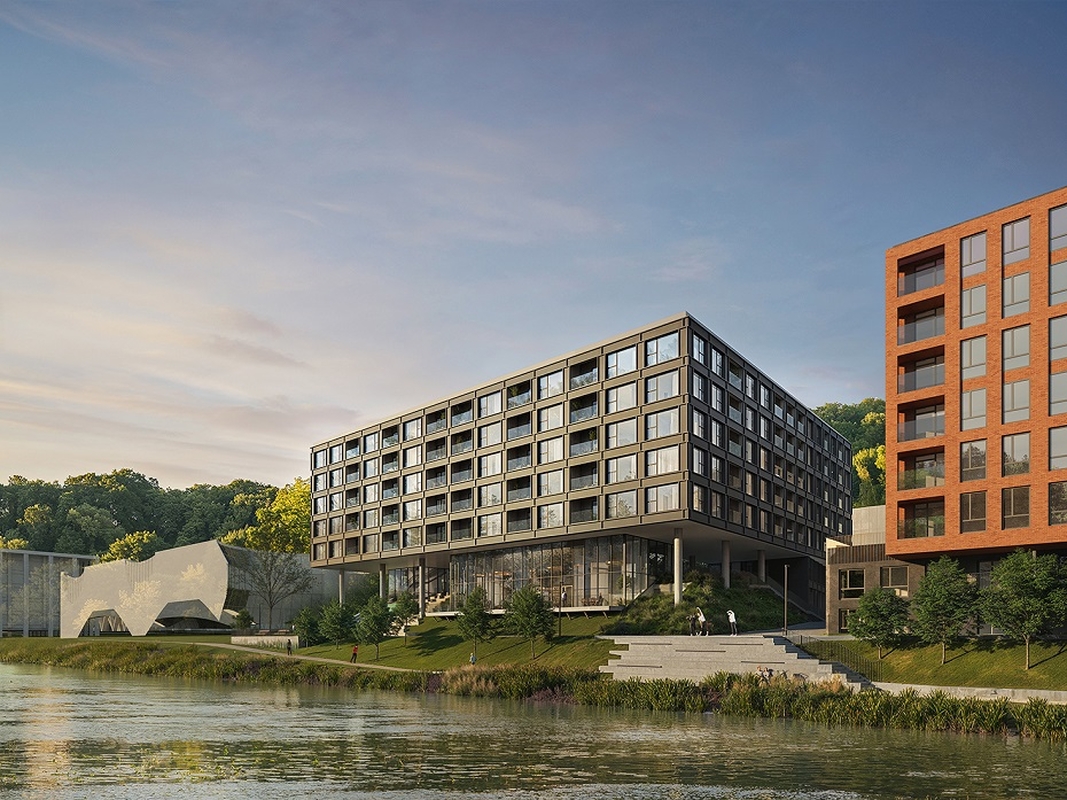 Daug dėmesio skiriama projekto architektūrai – pastatas suprojektuotas taip, kad iš Nemuno salos, upės pusės atrodytų lyg pakibęs ore, lengvas. Pasak K. Taleto, šis sprendimas – vienas iš didesnių iššūkių projekte. „Statant trečiąjį aukštą naudosime įtemptosios armatūros lynų technologiją, kuri ir leis išpildyti architekto Rolando Paleko komandos idėją, lyg ore pakabinti penkis gyvenamuosius pastato aukštus ir pro kiemo plyšį turėti saulės šviesą“.
