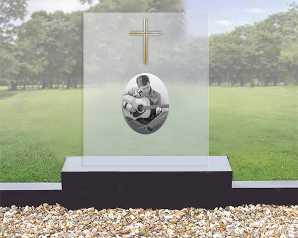 Idėja: stiklinės detalės gali perteikti nuotraukas, svarbias citatas, be to jos dera su kitomis medžiagomis, todėl galima sukurti originalų paminklą. („Stiklitos“ nuotr.)