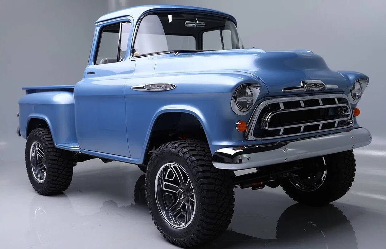Aukcionas „Barrett-Jackson“ reklamuoja iš pagrindų restauruotą 1957-ųjų pikapą „Chevrolet 3100“.