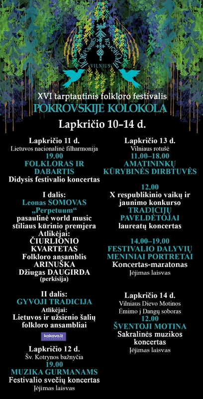 Lapkričio 14 d. 12 val. festivalis tradiciškai atsisveikins sakralinės muzikos koncertu „Šventoji motina“, kuris vyks Vilniaus Dievo Motinos ėmimo į dangų katedroje (Maironio g. 12). Bažnytinę dainuojamąją poeziją, tradicines giesmes bei psalmes atliks įvairių šalių folkloro kolektyvai.