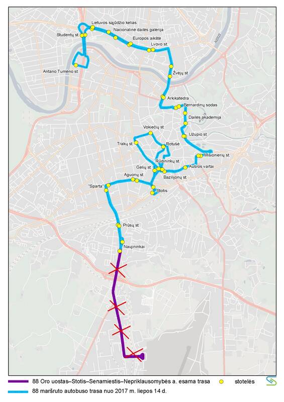 Liepos 14 d. – rugpjūčio 17 d. 88–ojo Oro uostas–Stotis–Senamiestis–Nepriklausomybės a. autobusų maršruto trasa bus trumpinama iki Naujininkų stotelės, o naktinio 88N Oro uostas–Stotis–Senamiestis–Nepriklausomybės a. autobusų maršruto trasa – iki Stoties. Autobusai į įprastines maršrutų trasas grįš nuo rugpjūčio 18 d., o naktiniai – naktį iš rugpjūčio 18 d. į 19 d.
