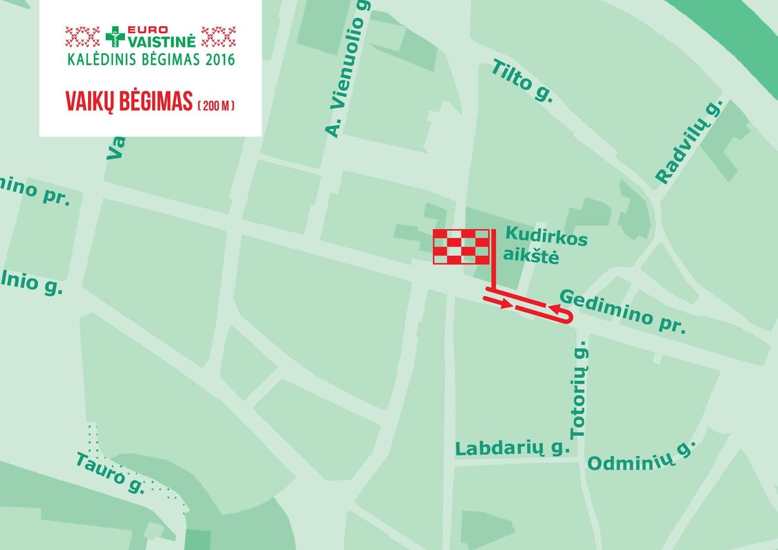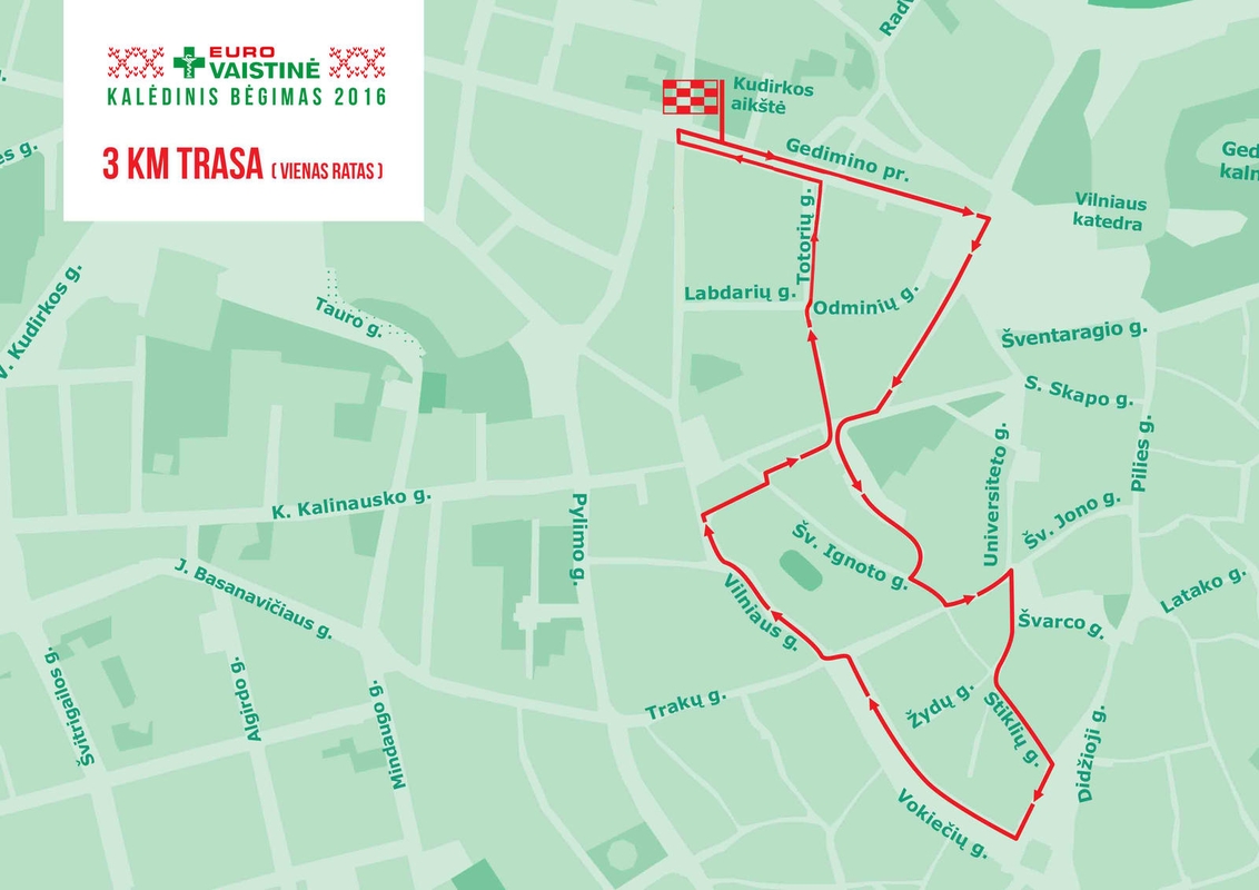 3 km bėgimo trasoje – Gedimino prospektu, Šventaragio, L. Stuokos-Gucevičiaus, Liejyklos, Totorių, Benediktinių, Šv. Ignoto, Dominikonų, Gaono, Stiklių, Didžiąja, Vokiečių, Vilniaus, Liejyklos, Totorių gatvėmis ir Gedimino prospektu iki Vinco Kudirkos aikštės.
