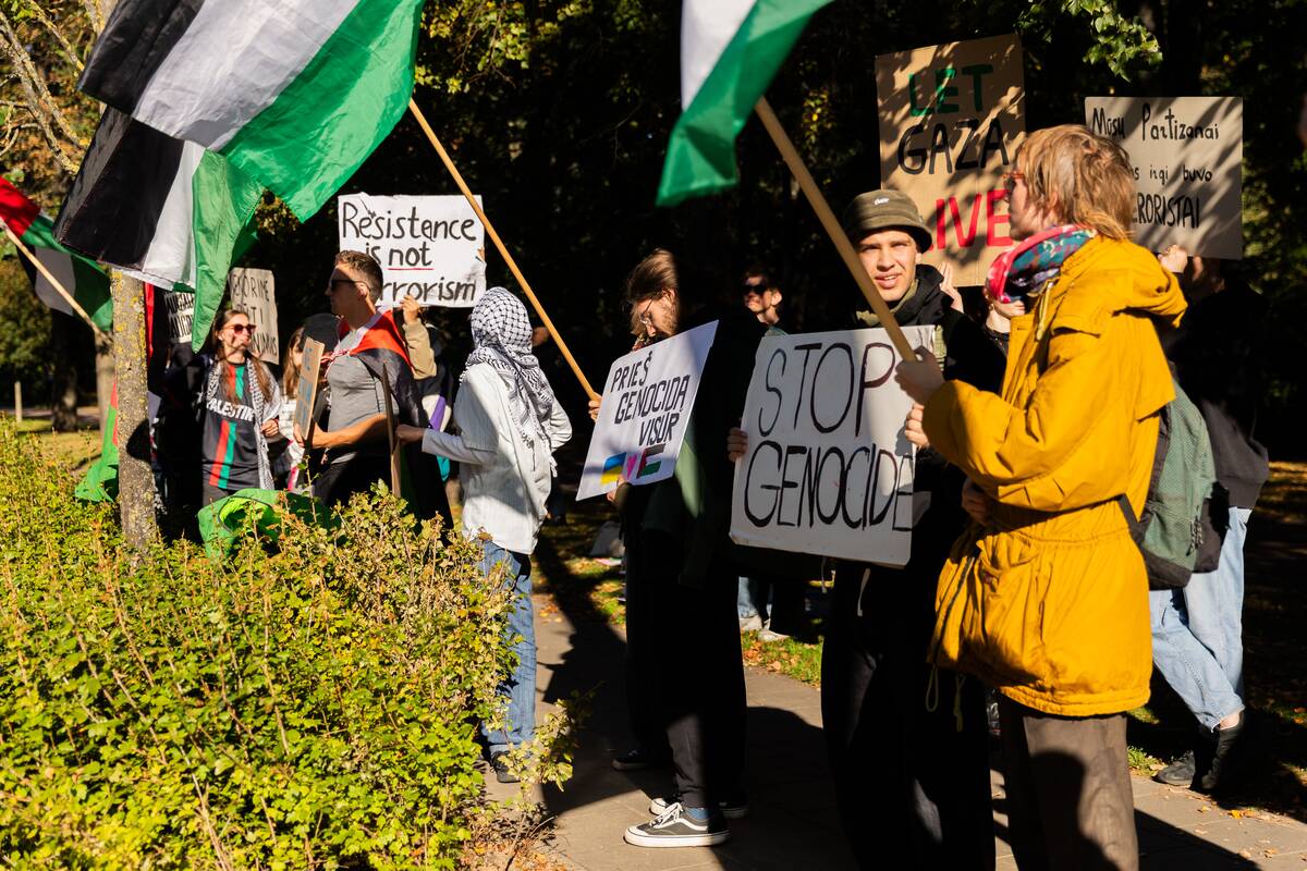 Nešini plakatais „Gaza persekios mus amžinai“, „Nenorime būti bendrininkais“, „Izraelis neturi teisės į genocidą“, didžiulėmis Palestinos ir Libano vėliavomis, penktadienio popietę susirinkę protesto dalyviai reikalavo, kad URM bei kitos valstybės institucijos imtųsi veiksmų užtikrinant flotilės įgulų bei laivų saugumą.