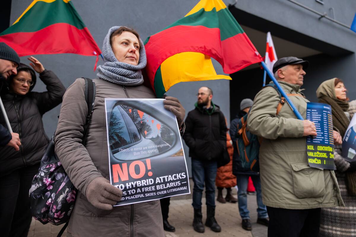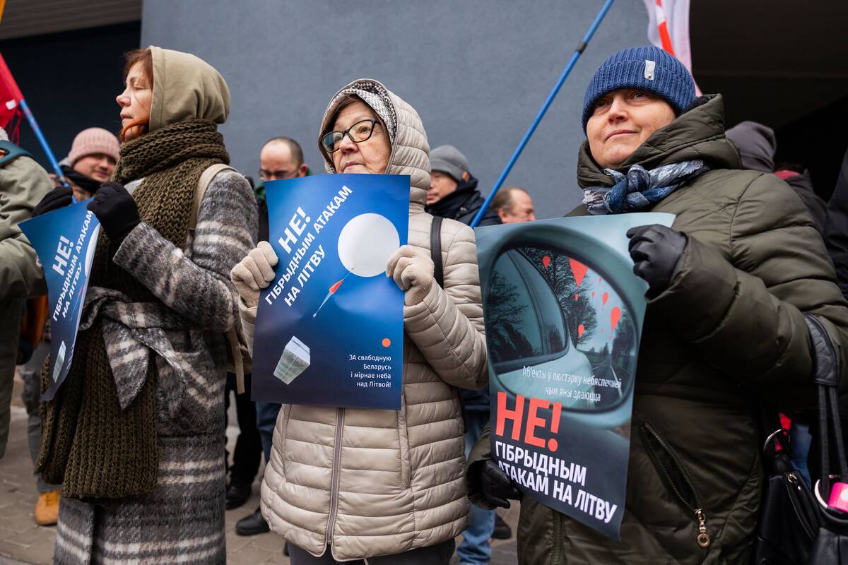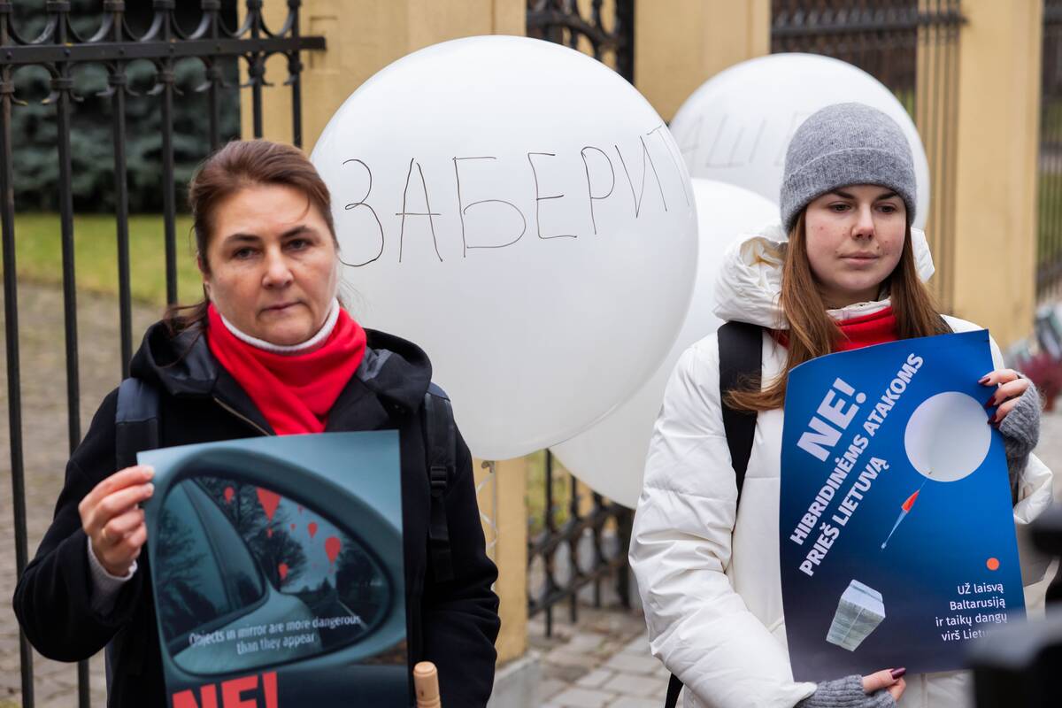 Į Lietuvą vis įskrendant iš Baltarusijos leidžiamiems balionams su kontrabanda, apie 30 žmonių prie kaimyninės šalies ambasados Vilniuje protestavo dėl kontrabandinių balionų keliamos grėsmės.