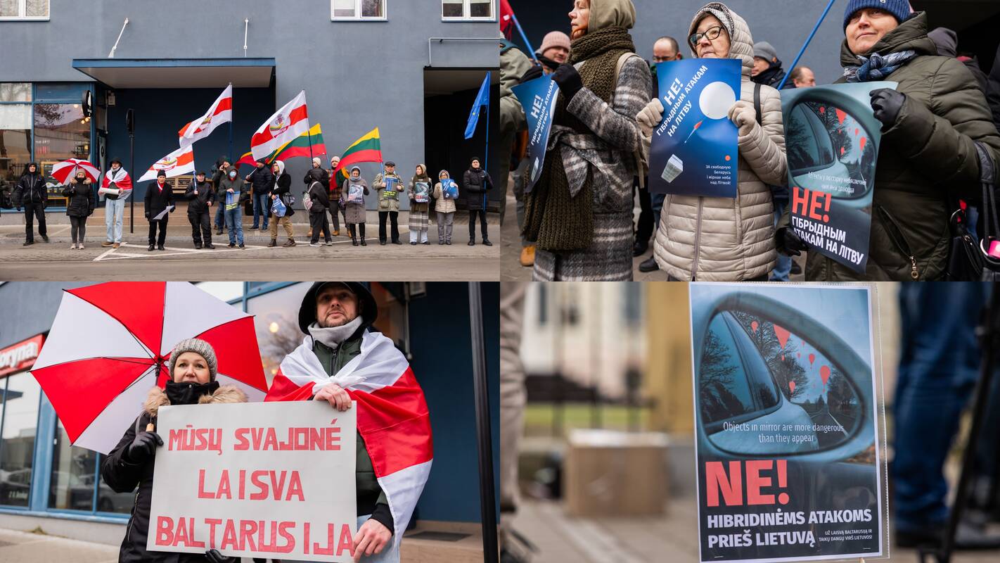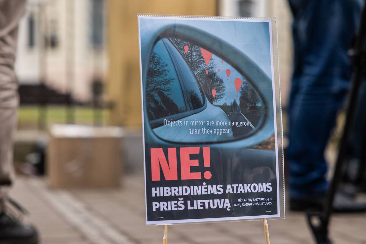 Protestuotojai Mindaugo gatvėje laikė plakatus „Ne! Hibridinėms atakoms prieš Lietuvą“, „Už laisvą Baltarusiją ir taikų dangų virš Lietuvos“, „Mūsų svajonė – laisva Baltarusija“.