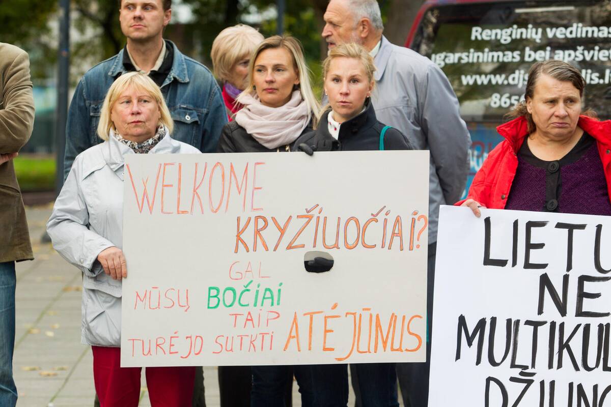 Vienų plakatai skelbė „Stop maurų invazijai“, „Lietuva - ne multikultūrinės džiunglės“, kitų - „Refugee welcome“ (Pabėgėli, sveikas atvykęs“, „Jei šiandien neįtinka pabėgėliai, rytoj neįtiks Lietuvos gyventojai“.
