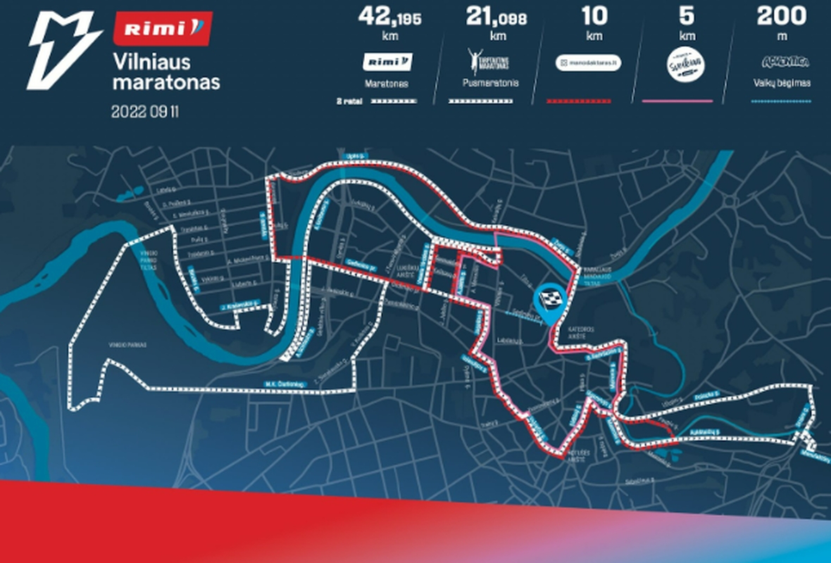 – Pusmaratonio (21,098 km) bėgimo trasa: nuo Katedros aikštės Šventaragio, T. Vrublevskio gatvėmis, per Karaliaus Mindaugo tiltą, Žvejų, Upės, Vytauto, A. Mickevičiaus gatvėmis, Neries krantinės dviračių taku Žvėryno pusėje, Vytauto, J. I. Kraševskio, Birutės gatvėmis, Vingio parko tiltu, Vingio parko dviračių taku, M. K. Čiurlionio gatve, Vingio parko dviračių taku, M. K. Čiurlionio, Vinco Kudirkos gatvėmis, Gedimino prospektu, A. Goštauto, Vasario 16-osios gatvėmis, Gedimino prospektu, Jogailos, Islandijos, Vilniaus, Domininkonų, Vokiečių, Rotušės a., Didžiąja, Pilies, Bokšto, Išganytojo, Maironio, Aukštaičių, Paupio gatvėmis, Vilnios taku, Zarasų, Polocko, Užupio, Maironio, Barboros Radvilaitės, Šventaragio gatvėmis.