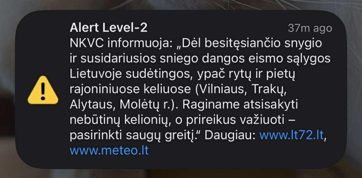 Gyventojai į mobiliuosius telefonus penktadienį gavo pranešimus, kuriais Nacionalinis krizių valdymo centras (NKVC) ragino atsisakyti nebūtinų kelionių, o prireikus važiuoti – pasirinkti saugų greitį.