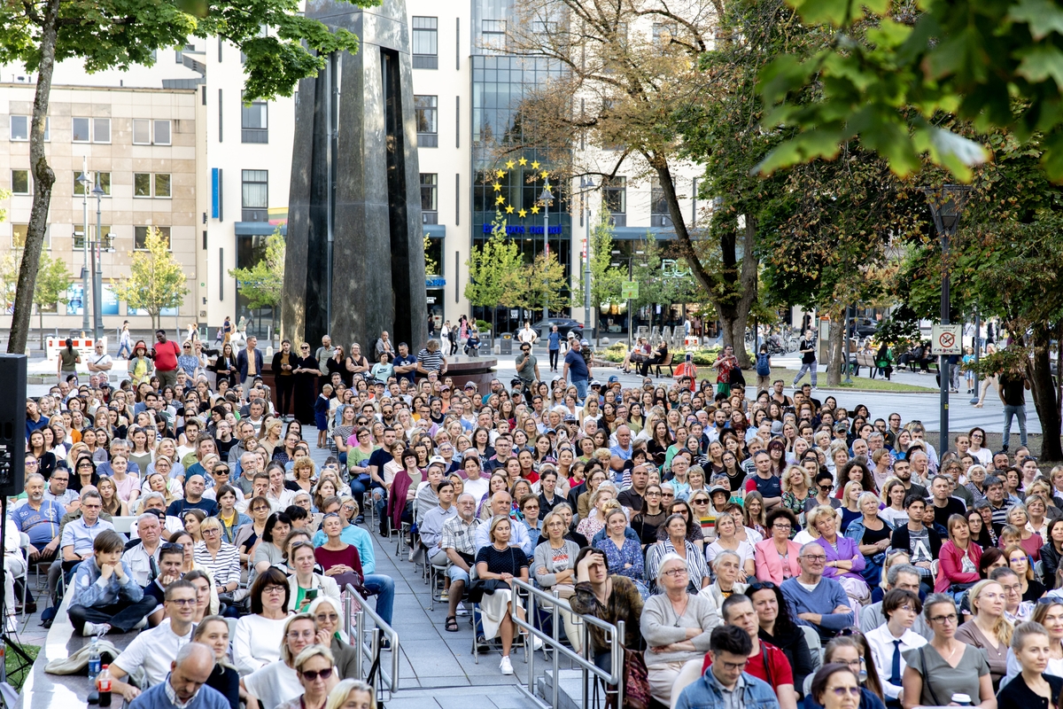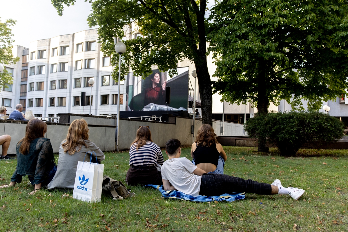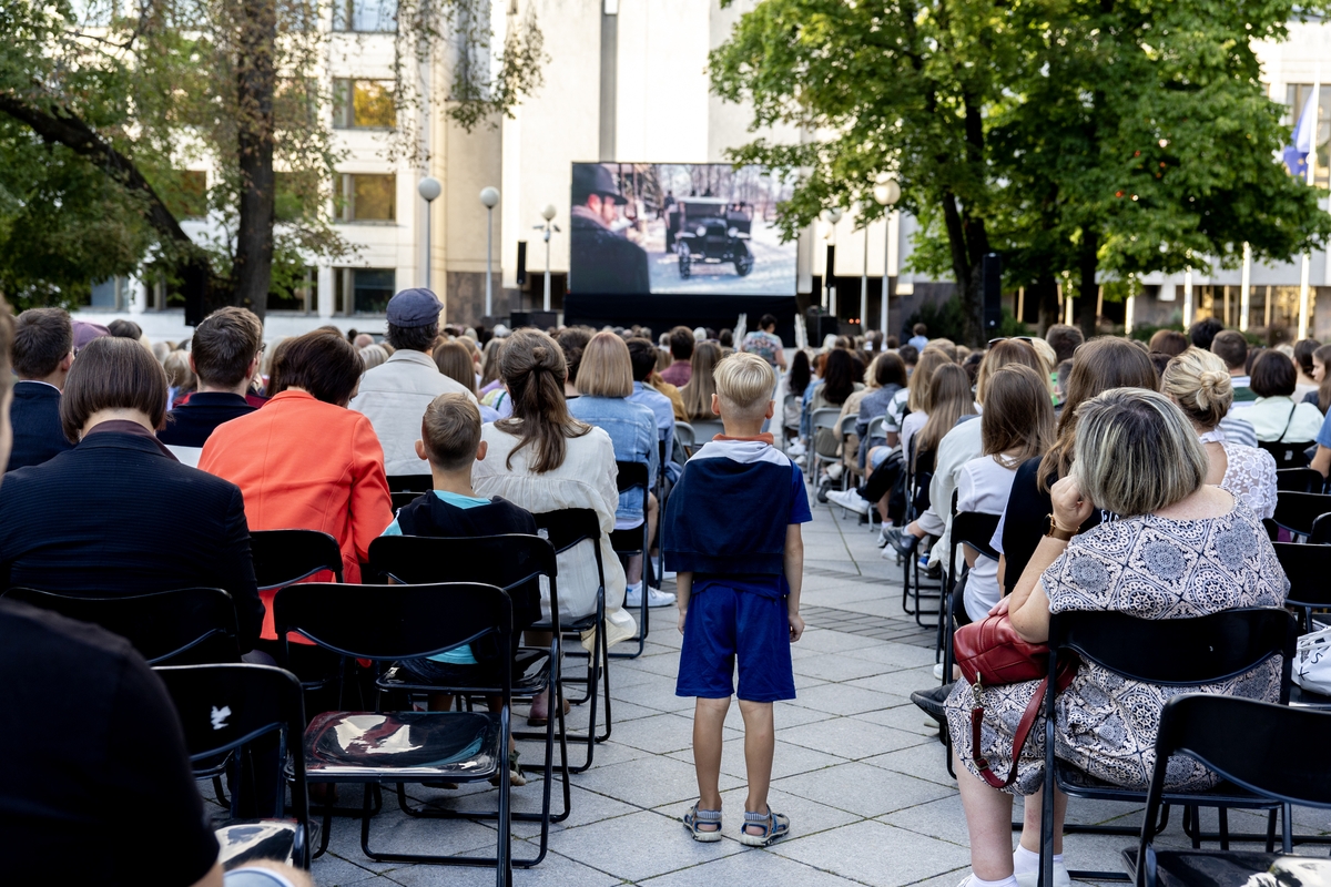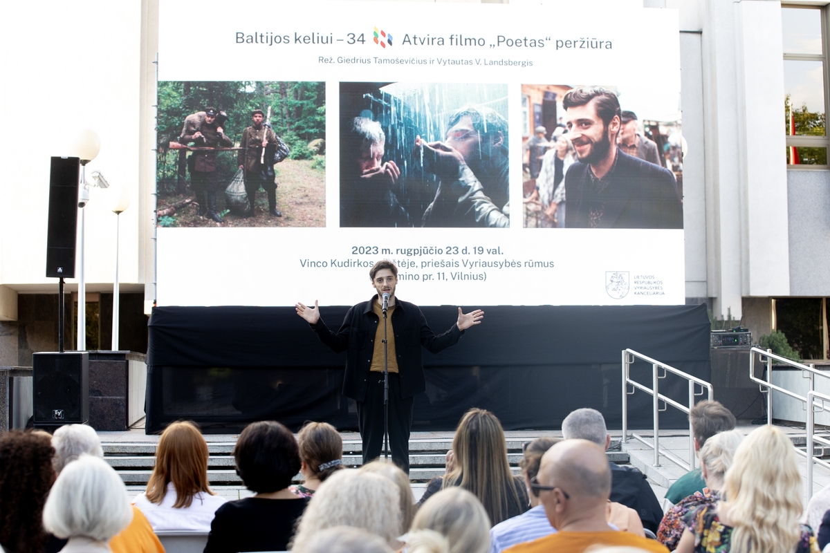 Daugiau kaip tūkstantis žmonių suplūdo į greta Vyriausybės rūmų įrengtą kino salę po atviru dangumi: prie pastato suprojektuotame ekrane buvo rodomas vienas naujausių lietuviškų filmų „Poetas“, kurį pristatė pagrindinio vaidmens atlikėjas – aktorius Donatas Želvys.