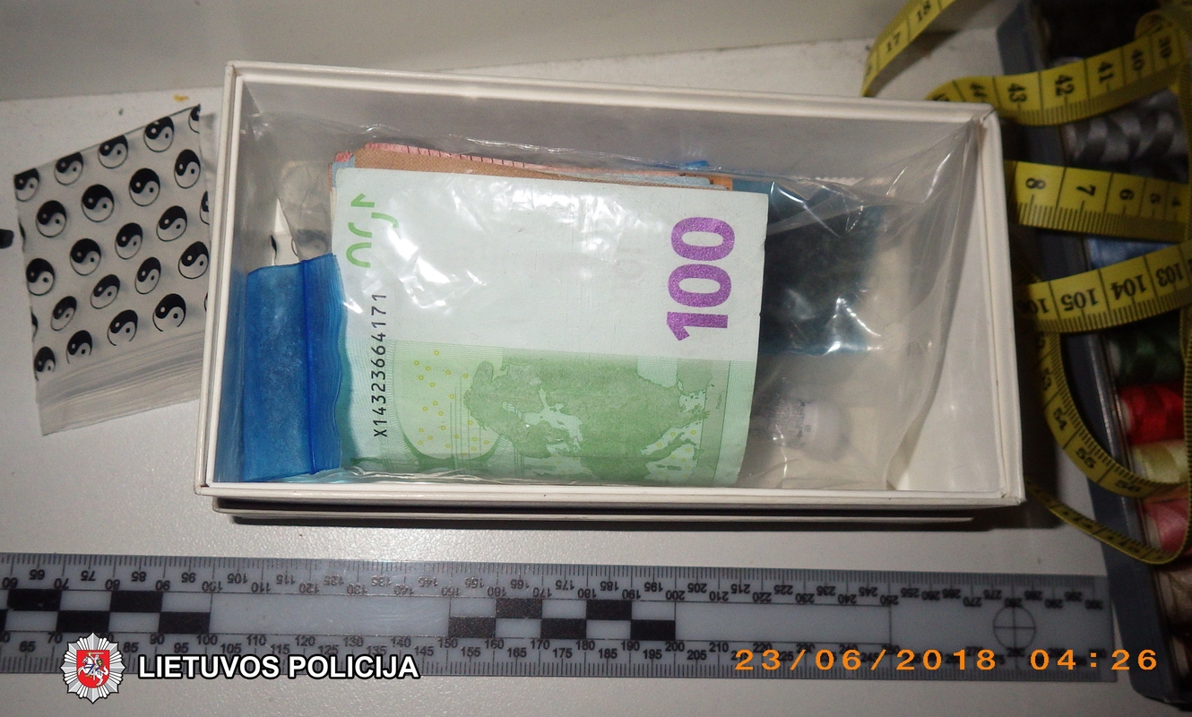 Vilniaus miesto trečiojo policijos komisariato pareigūnai aptiko ir paėmė, įtariama, narkotinių medžiagų: 214 įvairių spalvų tablečių, 70 polietileninių maišelių su geltona kristaline medžiaga, 25 polietileninius maišelius su įvairių spalvų milteliais, 2 polietileninius maišelius su augalinės kilmės medžiaga bei vazoną su augalu, turinčiu specifinį kvapą, 2 205 eurus, 3 elektronines svarstykles, 2 malūnėlius-smulkintuvus, 3 „bongus“ - rūkymo prietaisus, 4 mobiliojo ryšio telefonus, planšetinį ir stacionarų kompiuterius.